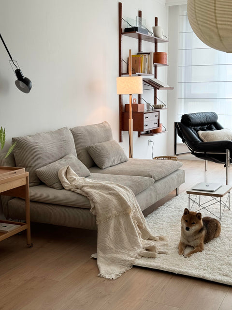 After a long day at work, the first thing Michi does when she gets home is to relax on her spacious couch. She enjoys reading, listening to music, or simply meditating, while Koharu quietly naps beside her. Over time, this living room has become an indispensable part of her life.